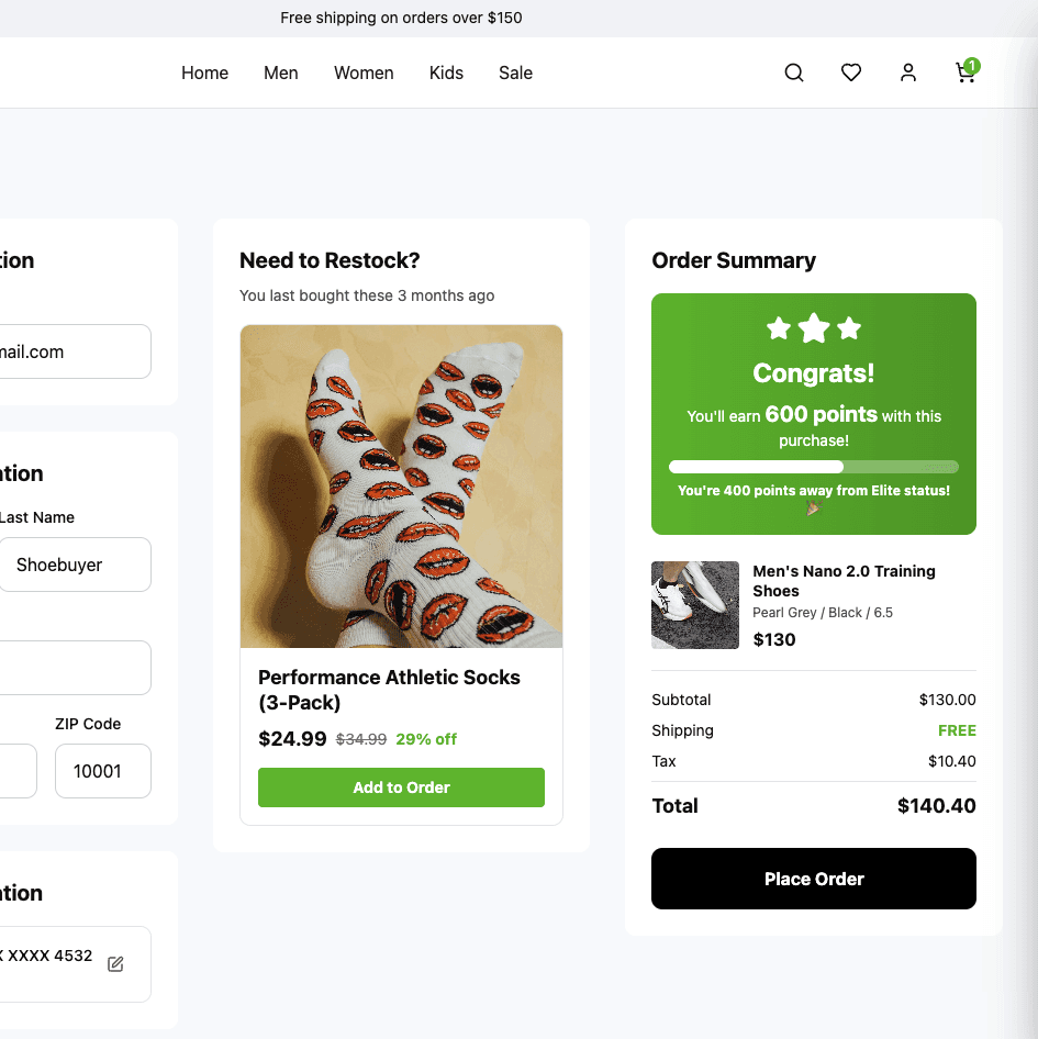 A progress indicator above Add to Cart showing proximity to elite status turns an abstract loyalty program into a live behavioral nudge. Customers on the threshold of an upgrade feel urgency that's genuine, not manufactured. Paired with smart replenishment suggestions ("You bought these 6 months ago"), the cart becomes a tool for both conversion and retention.