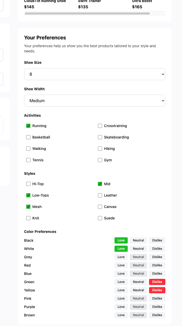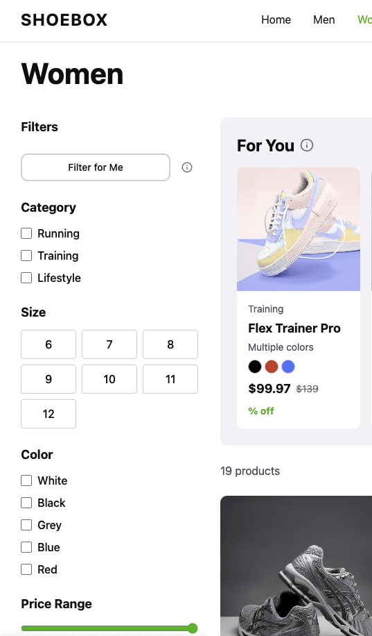 Explicit preferences live on the profile page — size, brands, styles. Behind the scenes, behavioral signals fill in the gaps. A one-tap "Filter for Me" button on category pages turns that profile into instant action, eliminating repetitive manual filtering on every visit. Saved preferences stop being passive data and start driving the purchase path.